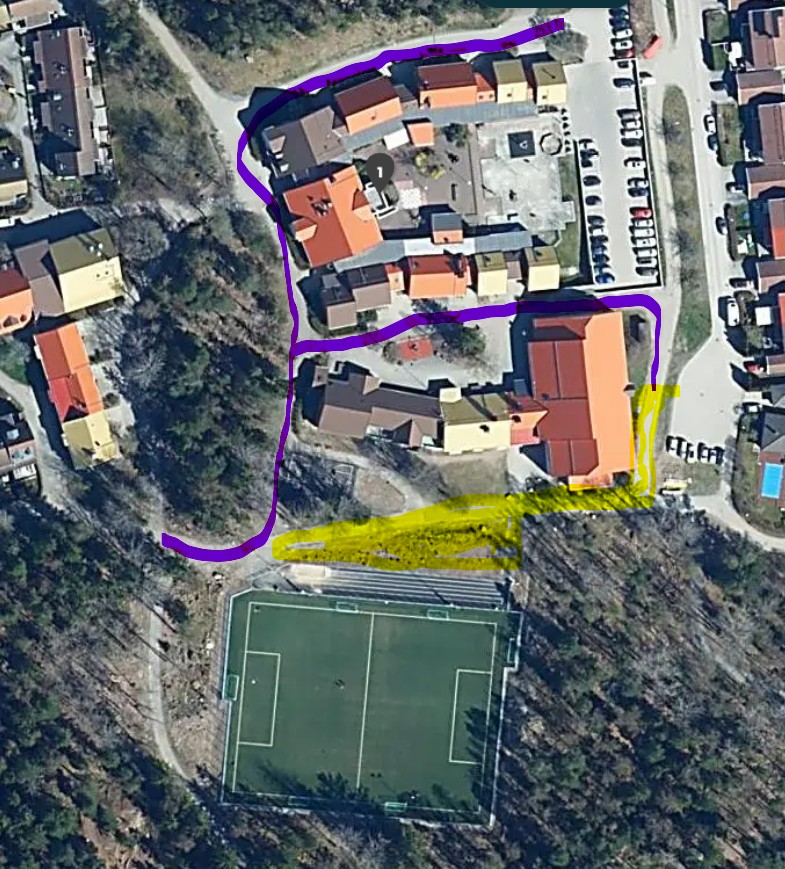 Mellan fotbollsplanen och idrottshallen vid Grimstaskolan. Begränsad framkomlighet på gångvägen denna period. Gångväg mellan idrottshall och skola finns, eller gångväg innan skolan finns.