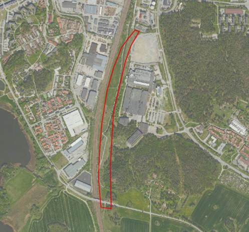 Planområdet ligger mellan järnvägen och Maraboufabriken.
